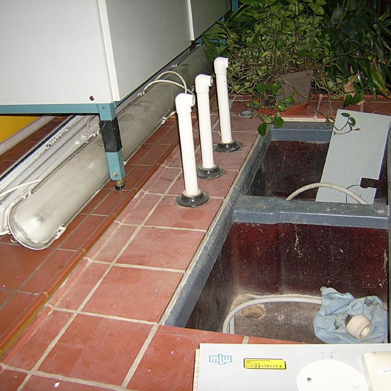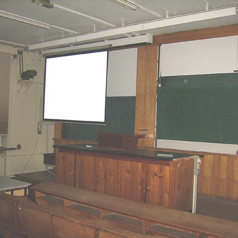 Im ehemaligen Physik-Hörsaal hat man offensichtlich eine neue Deckenbeleuchtung eingebaut. An den Seiten standen früher Fernsehgeräte, auf die das Kamerabild vom Lehrertisch übertragen wurde. Diese Technik ist inzwischen einem Beamer gewichen - zu unserer Zeit waren hier noch die Overheadprojektoren ("Polylux") üblich.