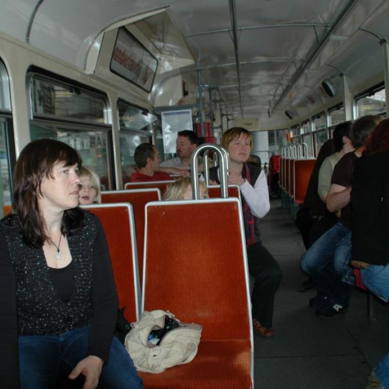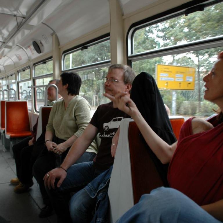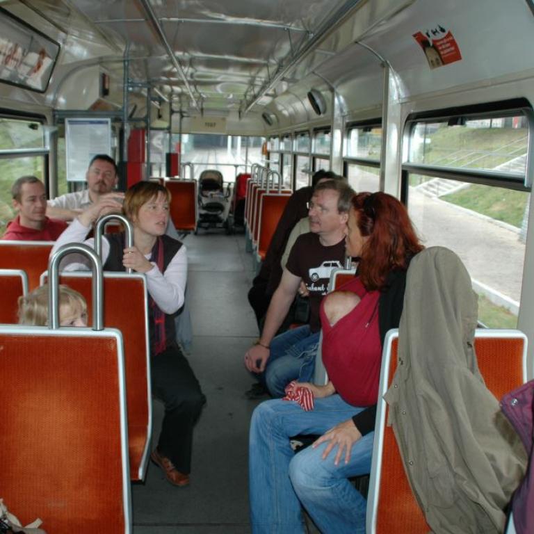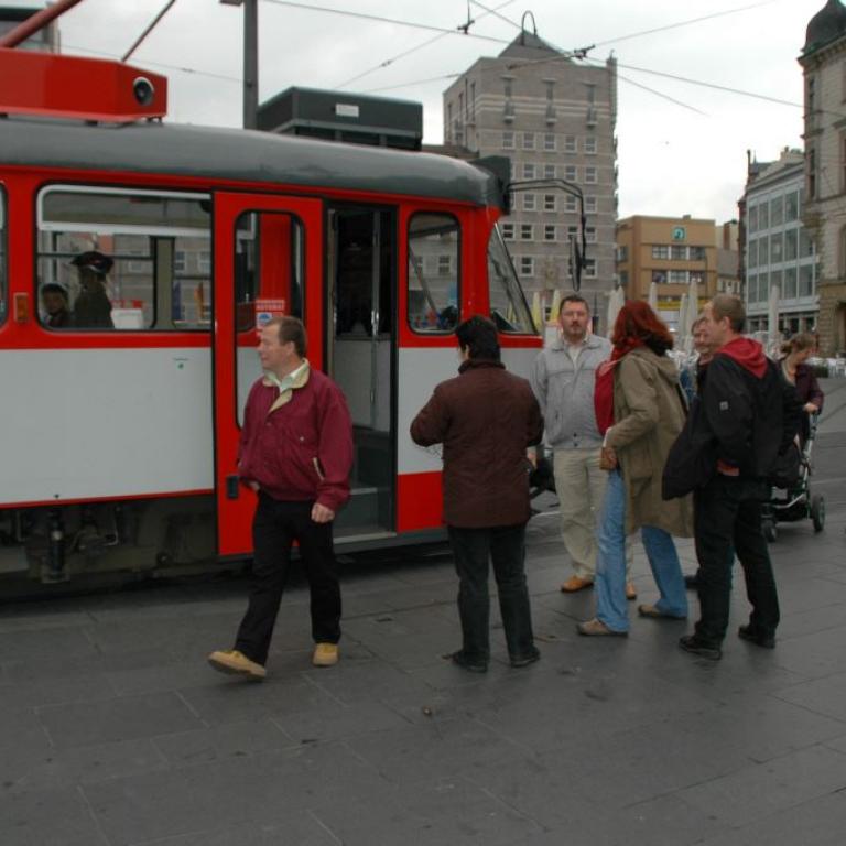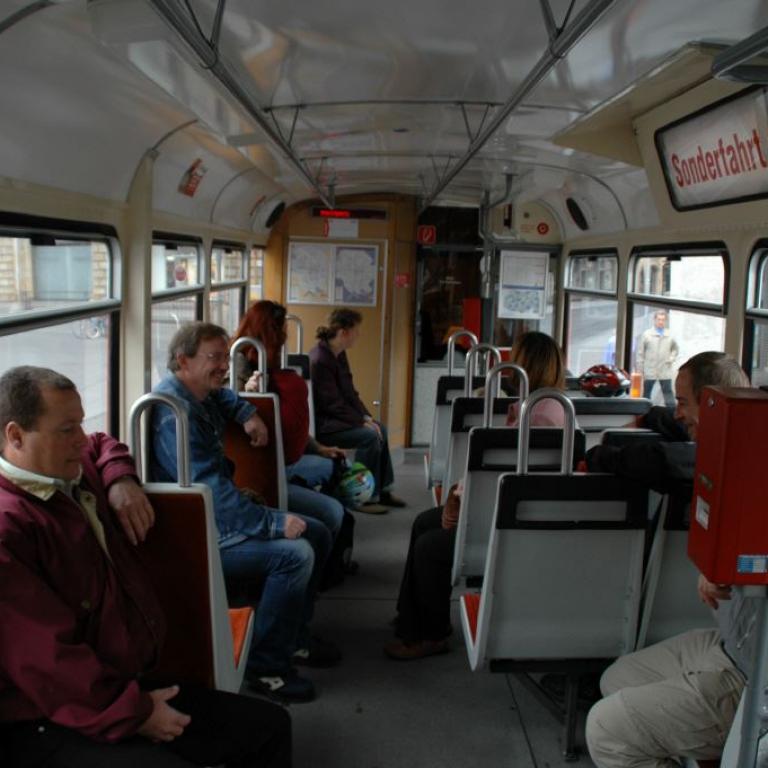 Die anderen liefen noch einmal hinunter zum Markt. Pünktlich kam eine olle Tatra-Bahn um die Ecke gebogen und wir konnten in einer einstündigen Sonderfahrt uns vertraute Strecken, aber auch viel Neues aus Sicht des Bahnfahrers entdecken.