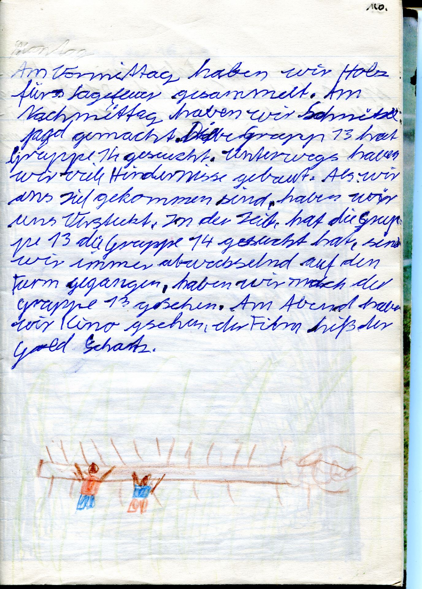 Neben dieser zentral verordneten Wanderung unternehmen wir mit unseren Jungs auch noch andere kleine Wanderungen - bloß raus aus dem Lager und hinein in die Natur! Wir merken den Kindern aus Buna, Halle-Neustadt, Merseburg deutlich an, dass sie sich gern mit uns im Wald herumtreiben, Wasserräder schnitzen und allerlei andere Spiele mitmachen. Wie leicht man die Leute doch begeistern kann!