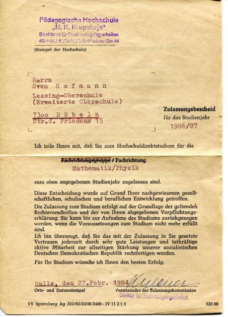 Im Oktober 1983 waren die Anträge für das Studium ab 1986 eingereicht worden - es musste ja erst noch der Wehrdienst "abgeleistet" werden.