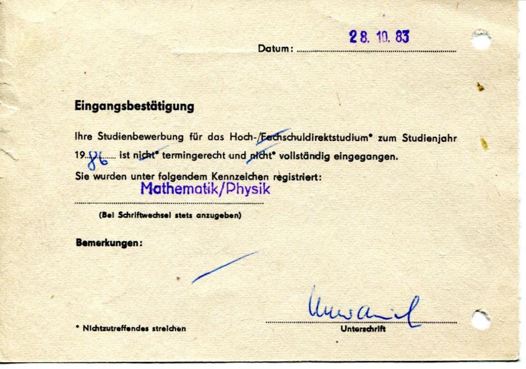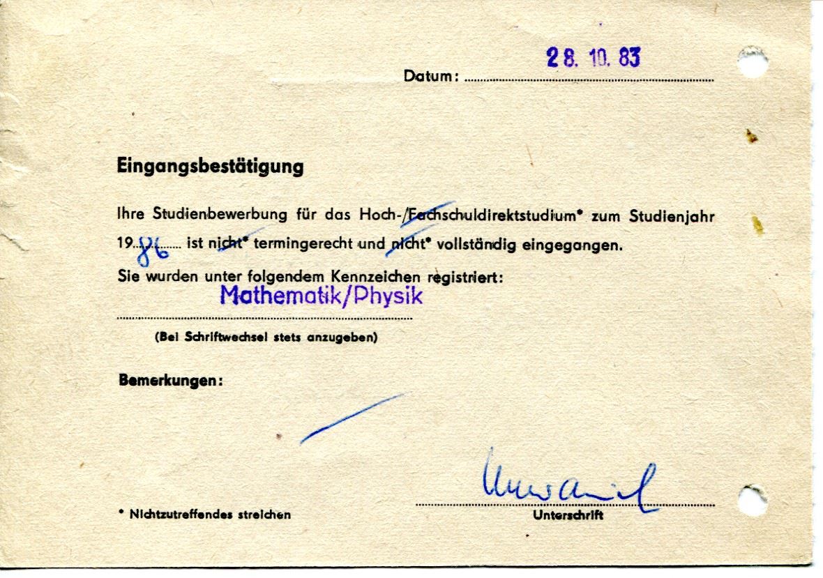 Im Oktober 1983 waren die Anträge für das Studium ab 1986 eingereicht worden - es musste ja erst noch der Wehrdienst "abgeleistet" werden.