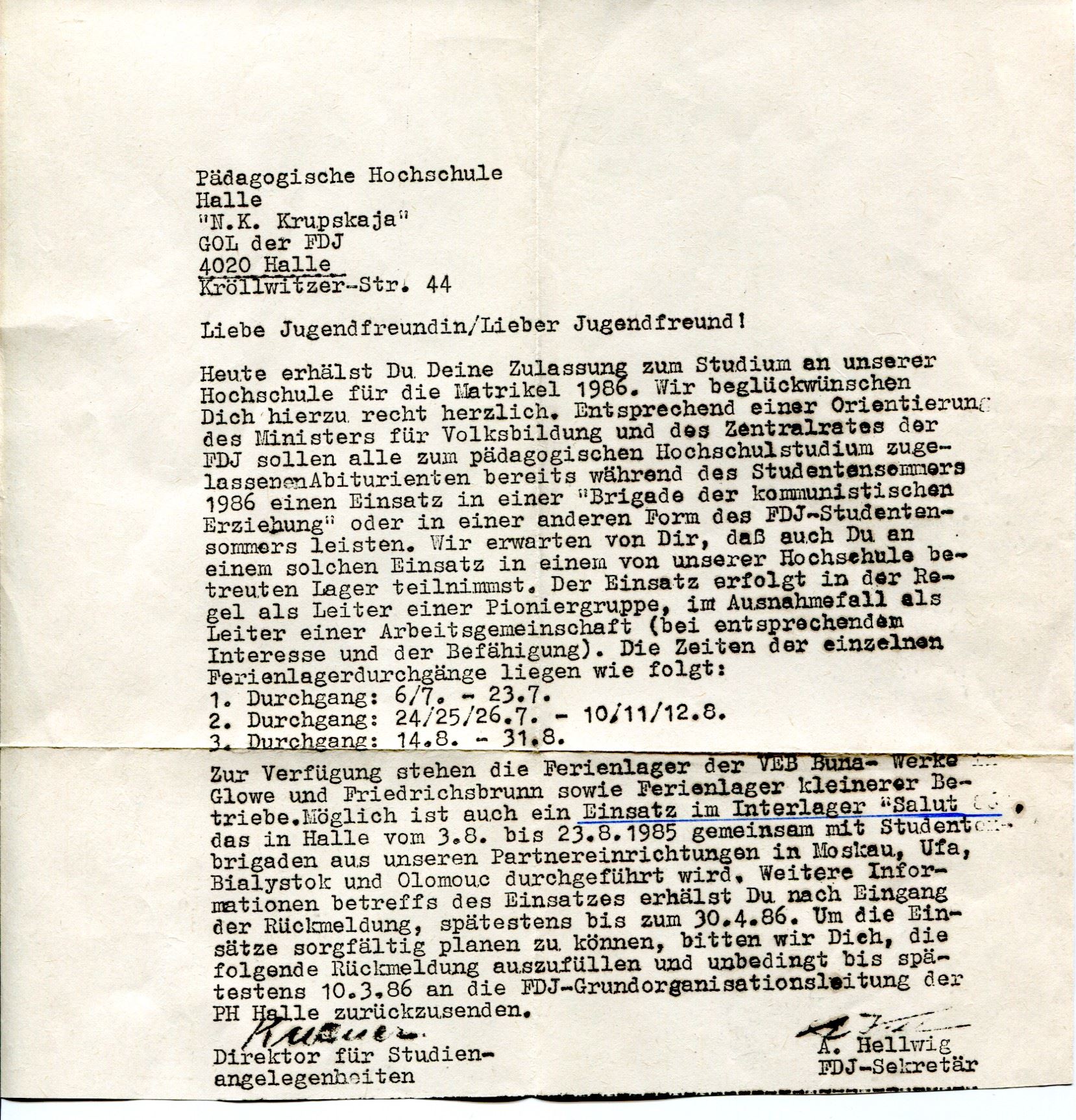 Es dauerte dann gar nicht mehr lange, bzw. kam im selben Brief mit der Zulassung auch gleich ein Schreiben der FDJ mit, in der es schon um den Studentensommer ging. Für uns war natürlich ein Einsatz im Ferienlager avisiert.