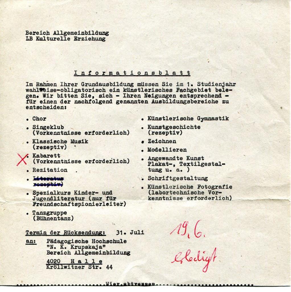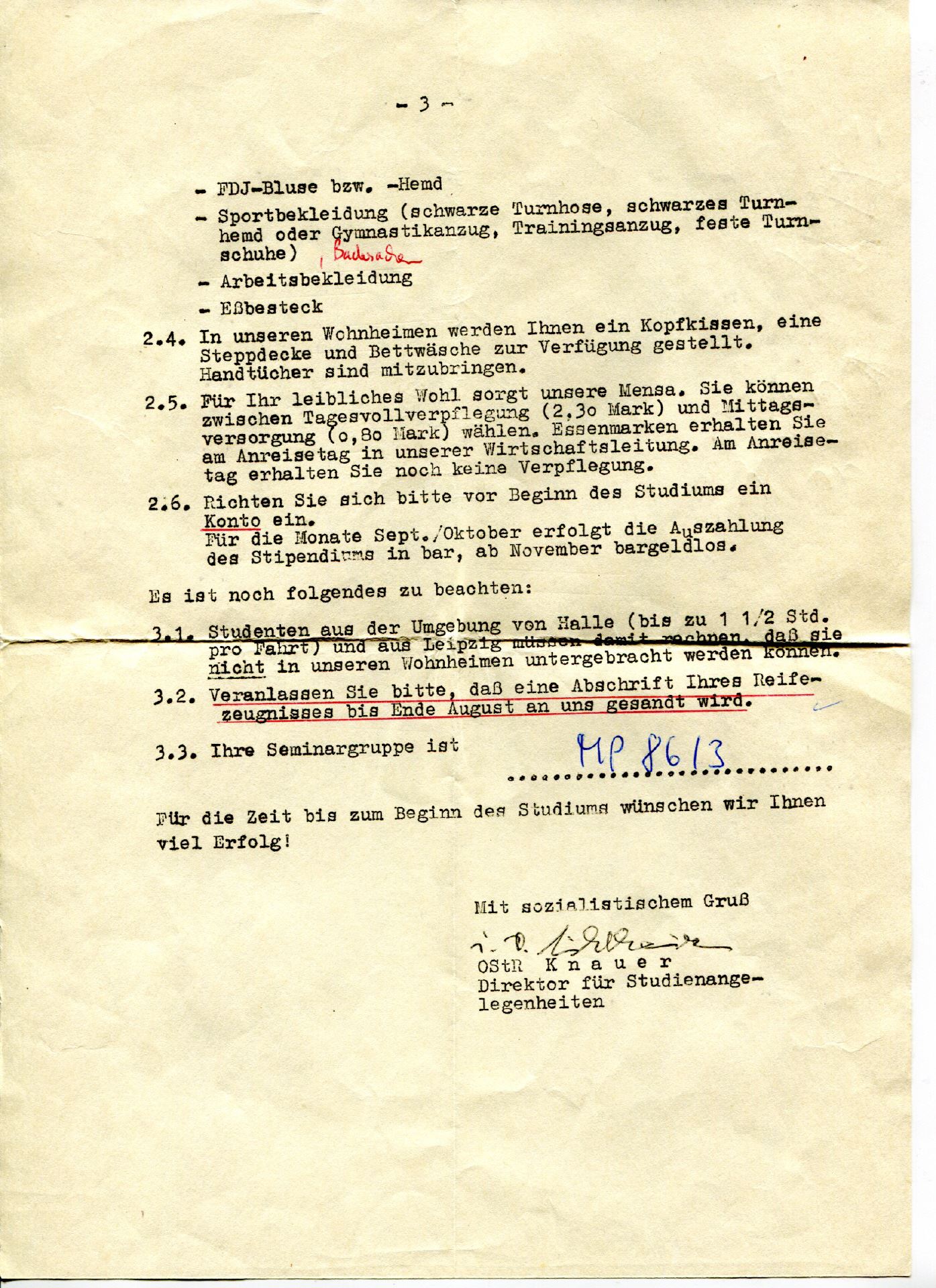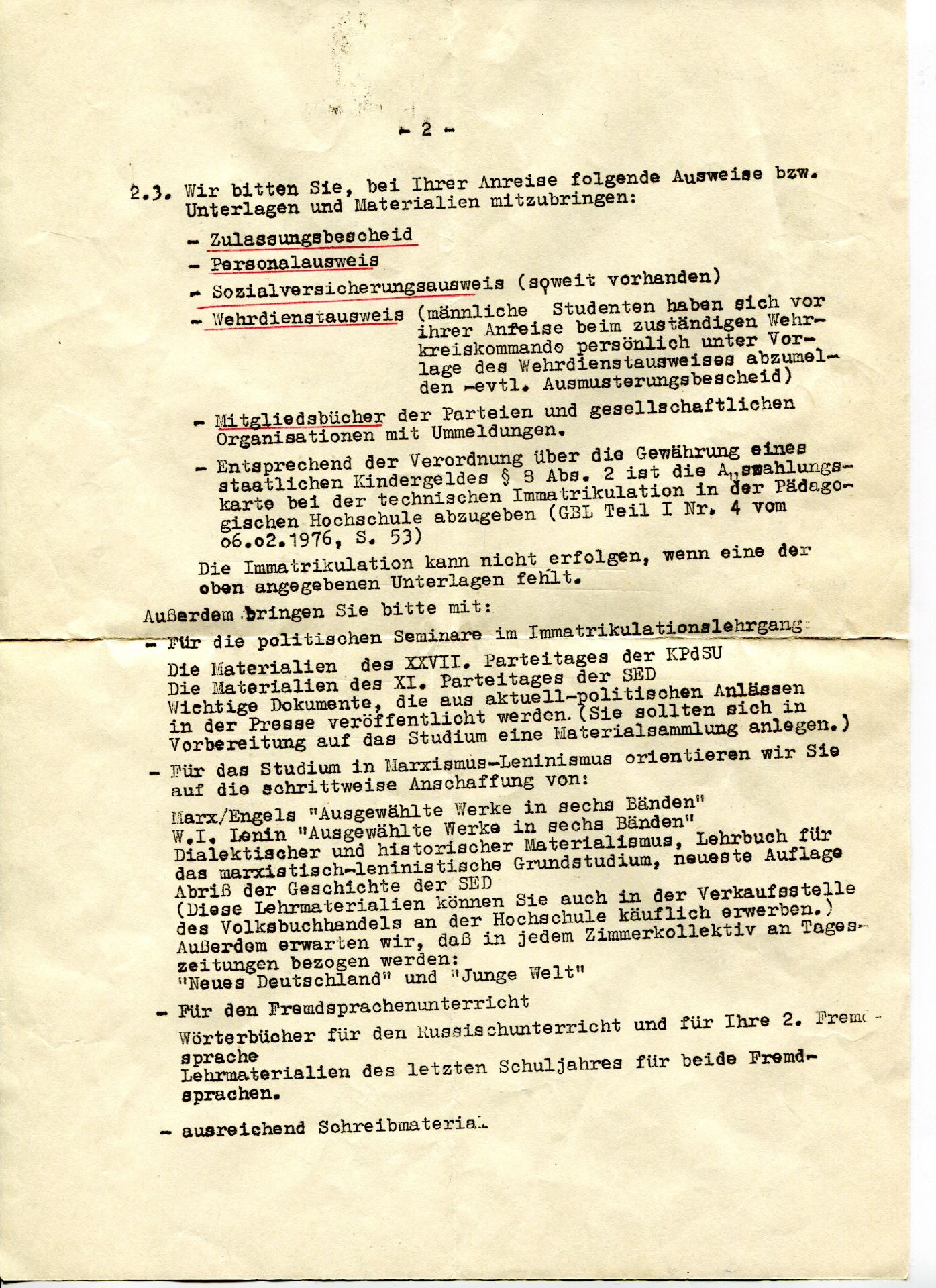 Interessant ist auch die Liste der mitzubringenden Literatur. Es soll tatsächlich Kommilitonen gegeben haben, die mit 6 Bänden Marx-Engels und 6 Bänden Lenin im Gepäck nach Halle angereist sind. Heute lachen wir drüber.