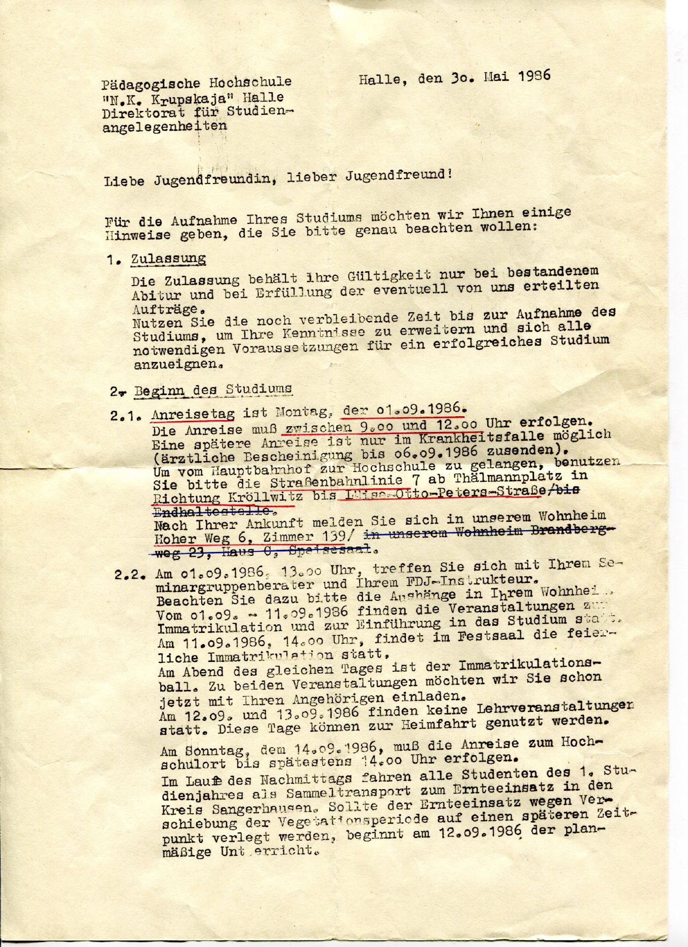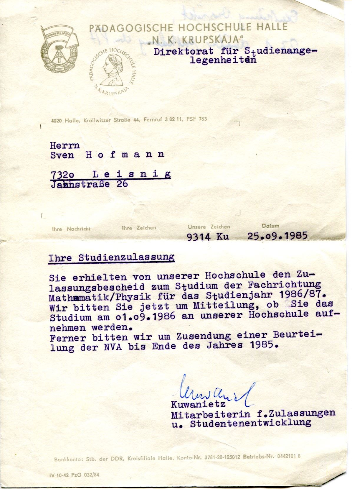 Im April 1986 kam dann der ersehnte Zulassungsbescheid und die schriftliche Aufforderung mitzuteilen, ob man den Studienplatz annimmt.