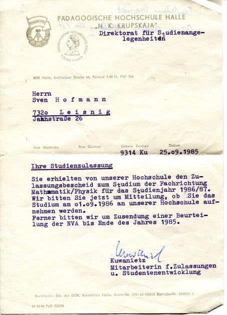 Im Oktober 1983 waren die Anträge für das Studium ab 1986 eingereicht worden - es musste ja erst noch der Wehrdienst "abgeleistet" werden.